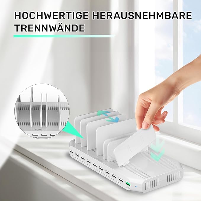 - Package includes: 1 x SUIDEK USB charging station, 1 x user manual (English language not guaranteed), 1 x power adapter and multiple dividers (charging cables are not included)