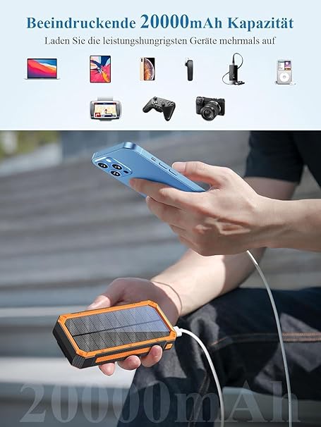 Solar Power Bank 20000 mAh, PD20W Waterproof Solar Charger USB C External Battery Solar Chargers with Outputs
